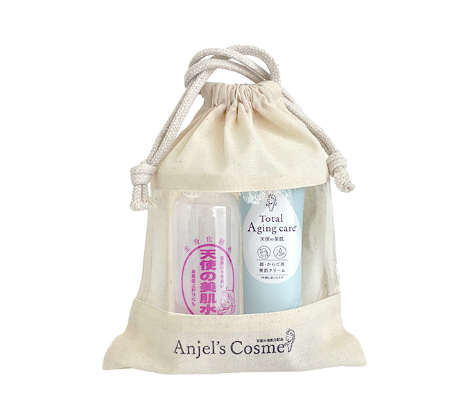 当セットは、シンプルな処方でデリケートな肌に配慮しながらしっかりうるおう「天使の美肌水(しっとり)」と、エイジングケアクリームをお試しサイズでご用意しました。